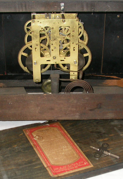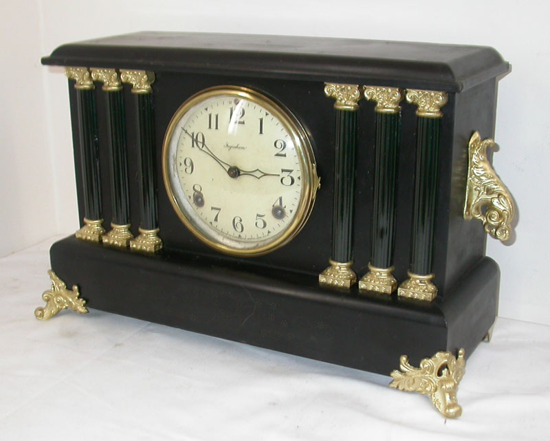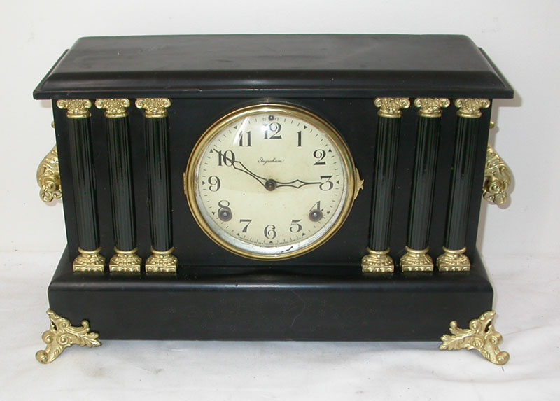 This stately black mantle clock with its lovely Grecian Columns was made by the E Ingraham Clock Company in New England in the early 1900s. The movement is original and has been completely overhauled and restored to great working condition. The gorgeous case with its ornate golden hardware and stately columns also has a gleaming brass bezel. It strikes the hour and the half hour on a melodious deep gong. Key and pendulum are included. It measures 17.5 inches by 6 inches by 10.5 inches high.