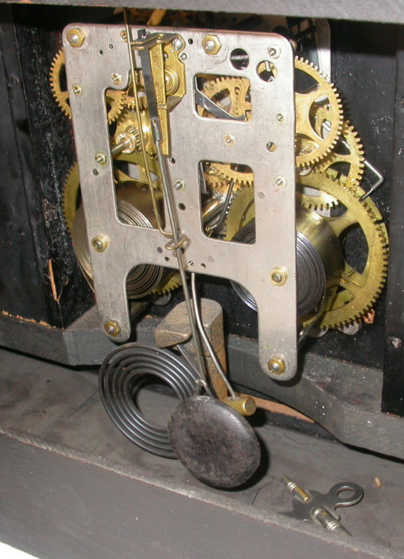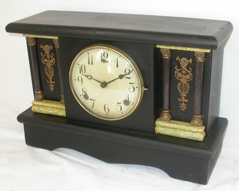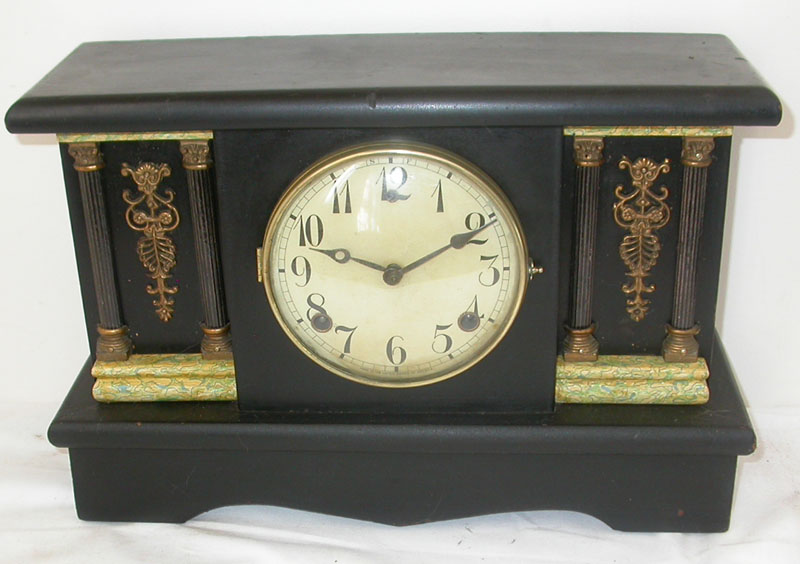 Elegant black mantle clock with lovely marbelized Grecian Columns and ornate brass fittings. Made in New England in the late 1800 or early 1900s by the Gilbert Clock Company. The movement has been completely overhauled and works well. It strikes the hour and the half hour on a deep gong. It measures 16 inches by 5.5 inches by 10.5 inches high.