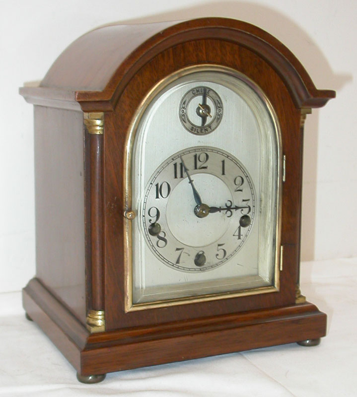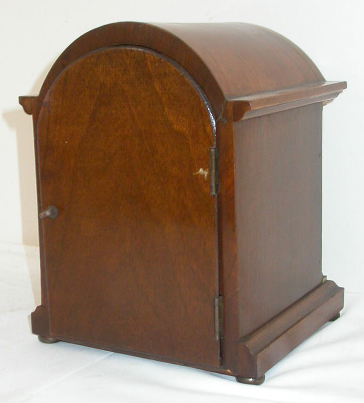 This gorgeous high quality miniature oak quarter hour chime bracket clock was made in Germany in the 1920-30s. The movement is marked Peerless over a letter M. It is original and has been completely overhauled and restored to great working condition. This makes the clock a real bargain because of the high cost of getting one overhauled & restored. The gorgeous oak case with its gleaming brass bezel is a high quality hardwood. The clock rings out every 15 minutes and strikes out the hours beautifully. The chimes are from a European church - not the usual Westminster ones. The attractive cabinet serves as a very fine sound box for the set of chimes. Key and pendulum are included. It measures 6.25 inches by 5.25 inches by 8.25 inches high.