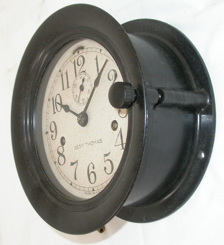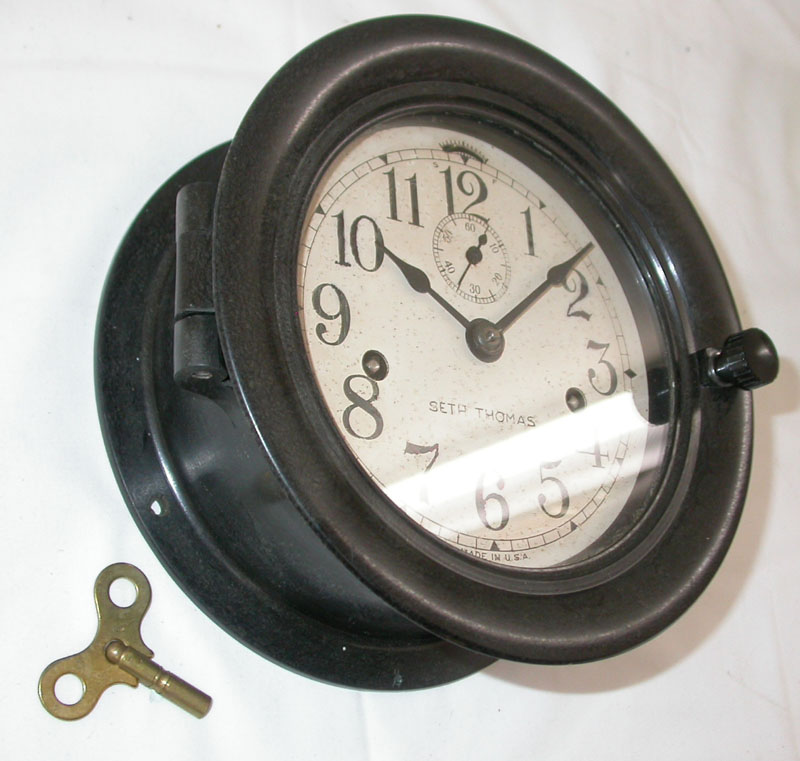 This vintage ships clock was made by the New England Seth Thomas Company in the earlier 1900s. The movement which has two mainsprings both driving the time gears is original and has been completely overhauled and restored to great working condition. The case looks to be bakelite and is in good condition. Key is included. It measures 8 inches in diameter by 3.75 inches high.