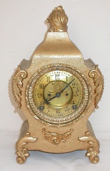 This ornate mantle clock was made in the early 1900s by the Ansonia Clock Company of New England. The movement with its attractive visible outside escapement is original and has been completely overhauled and restored to great working condition. The gorgeous golden metal case has an ornate gleaming brass bezel. It strikes the hour and the half hour on a melodious deep gong. Key and pendulum are included. It measures 7.5 inches by 4.75 inches by 13.5 inches high.