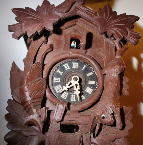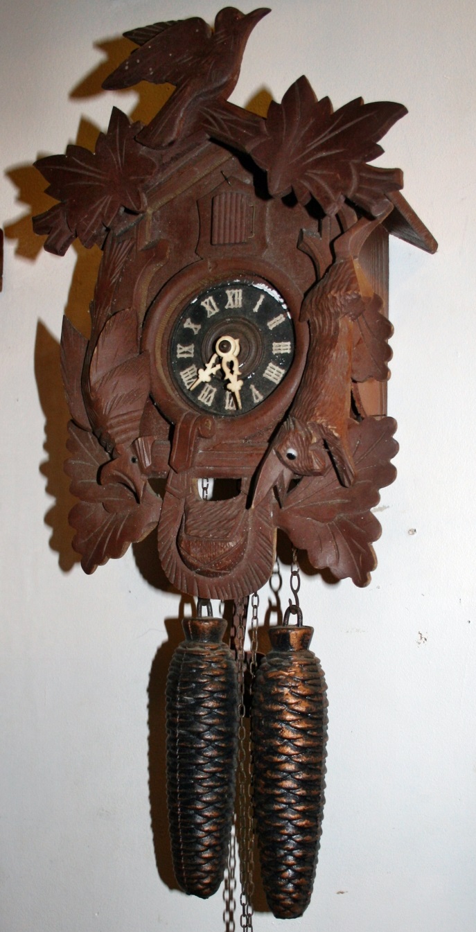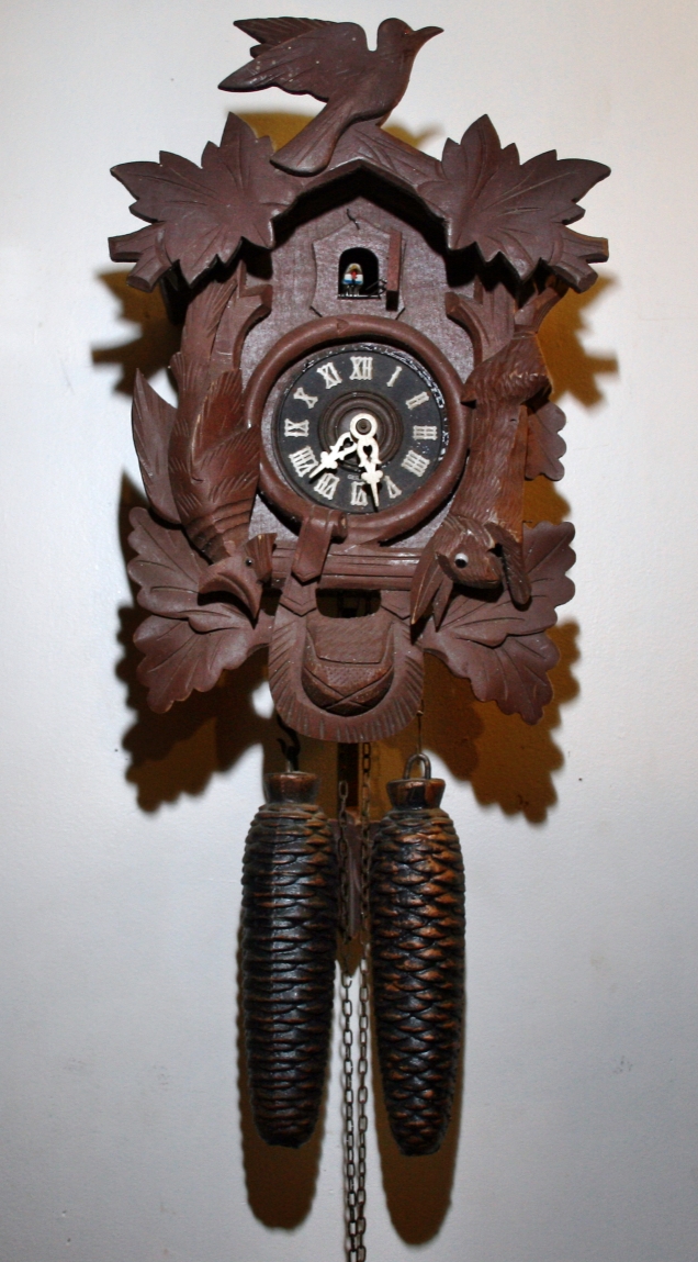 This classic cuckoo clock was made in the Black Forest area of Germany by E Schmeckenbecher in the 1930-40s. The 8 day movement is original and has been completely overhauled and restored to great working condition. The gorgeous typical Black Forest hunting case is in nice shape. The bird calls the hour and the half hours The case excluding the weights and pendulum measures 8.5 inches by 6 inches by 12 inches high.