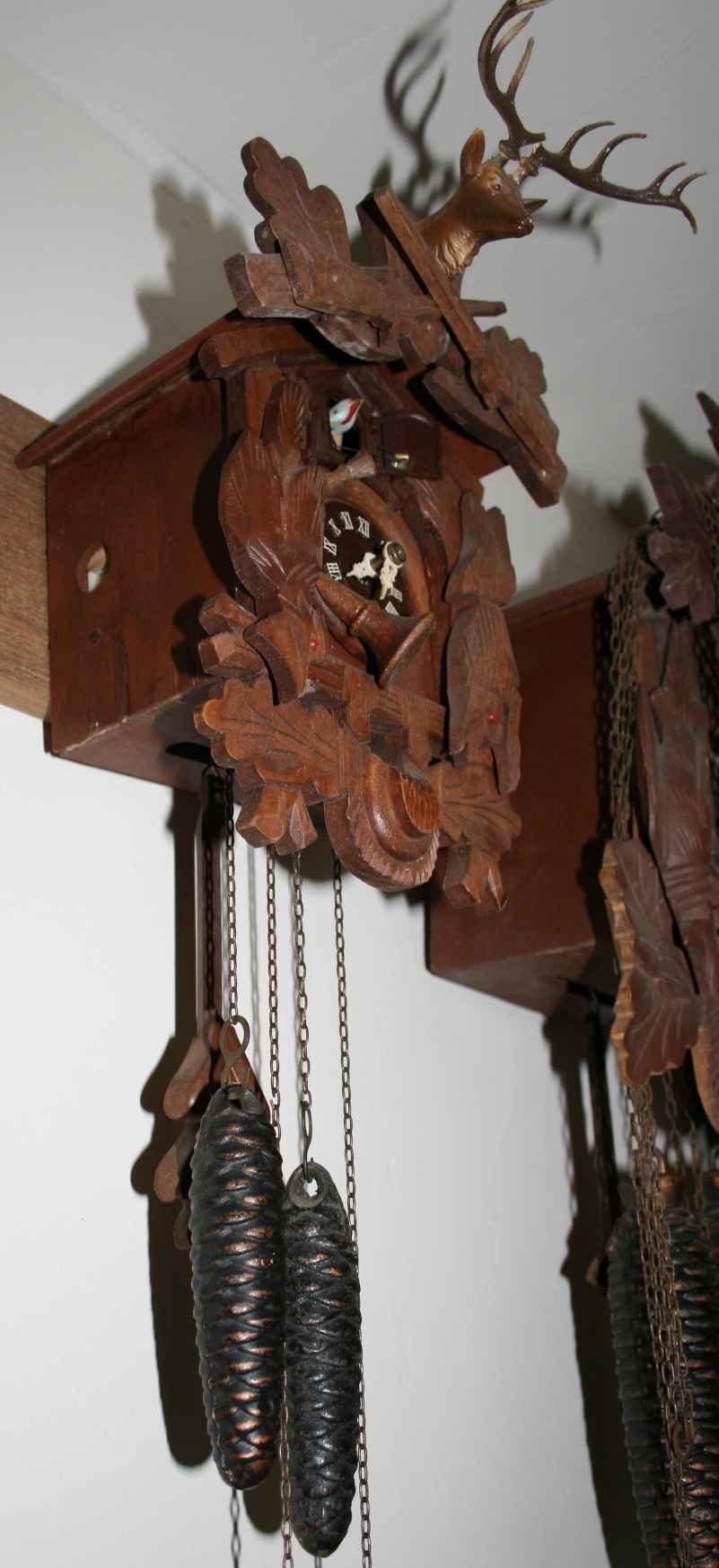 This attractive double weight driven cuckoo clock was made in the Black Forest area of Germany by Huber Herr in the 1930-40s. The movement is original and has been completely overhauled and restored to great working condition. The door opens to reveal a cuckoo bird who calls out the hour and the half hours. Clock measures 6 inches by 5 inches by 10 inches high.