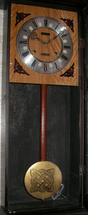 This very large wall regulator clock was made in the 1960-70s by the Cotrin Clock Company of Korea. The 31 day movement is original and has been completely overhauled and restored to great working condition. The gorgeous large dark case with its ornately designed gold pendulum is in good condition. Clock strikes out the hours on a melodious deep gong. Key and pendulum are included. It measures 13.5 inches by 5.5 inches by 38 inches high.