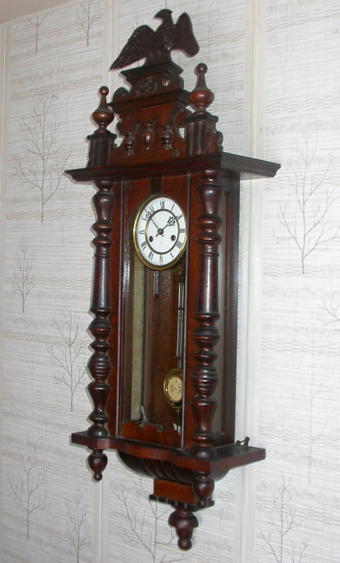 This superb large Vienna Regulator clock was made by the Hamburg American Clock Company of Germany in the 1930s. The movement is original and has been completely overhauled and restored to great working condition. The gorgeous case with its side windows and signed carved eagle on top is a high quality hardwood. It strikes the hour and the half hour on a melodious deep gong. Key and pendulum are included. It measures 14.5 inches by 6.5 inches by 42 inches high.