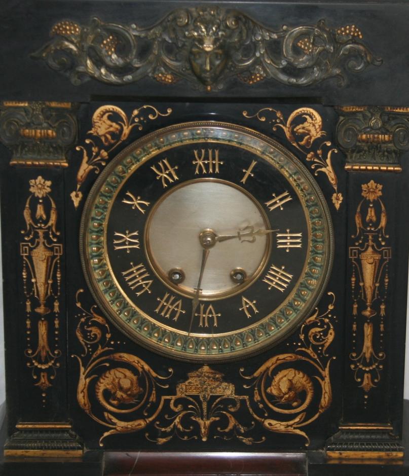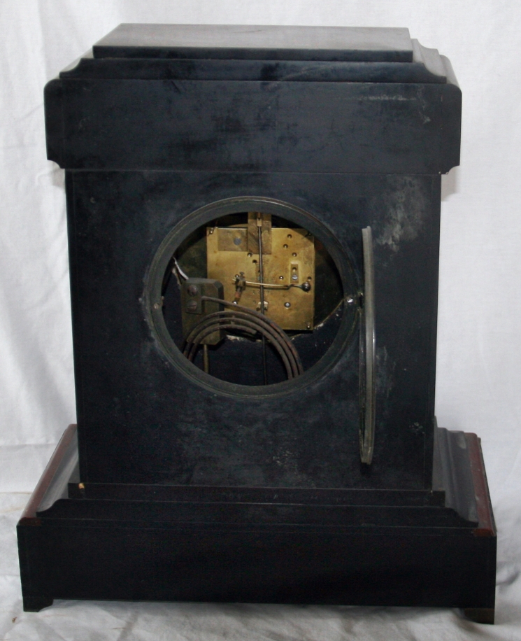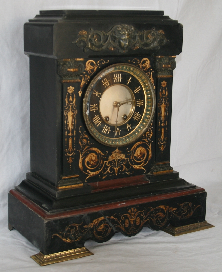 This superb French marble & slate bracket clock was made in the 1800s. It is large and very heavy. The movement has recently been fully serviced and the clock runs well The gorgeous case with its gleaming brass bezel is a high quality hardwood. It strikes the hour and the half hour on a melodious deep gong. Key and pendulum are included. It measures 17 inches by 9 inches by 19.5 inches high.