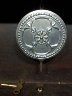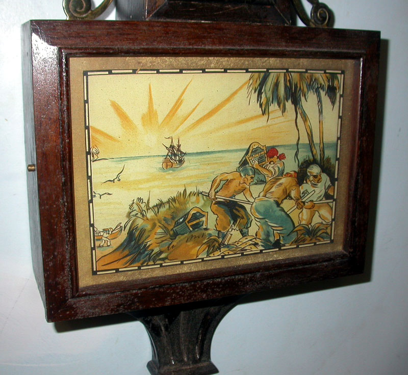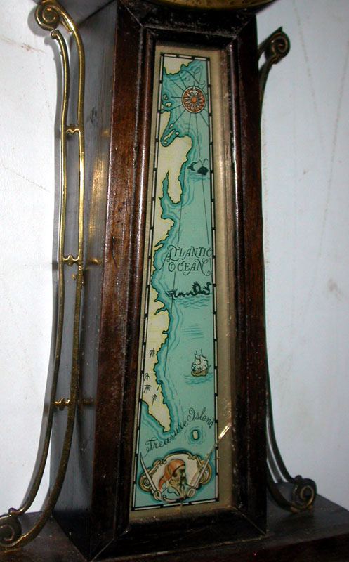 This Ingraham Treasure Island Banjo Wall Clock was made in the early 1900s. The movement is original and has been completely overhauled and restored to great working condition. It strikes the hour on a nice sounding chime rod.. Key and pendulum are included. There is a small crack in one corner of the centre glass panel. Clock measures 10.5 inches by 4.5 inches by 38 inches high.