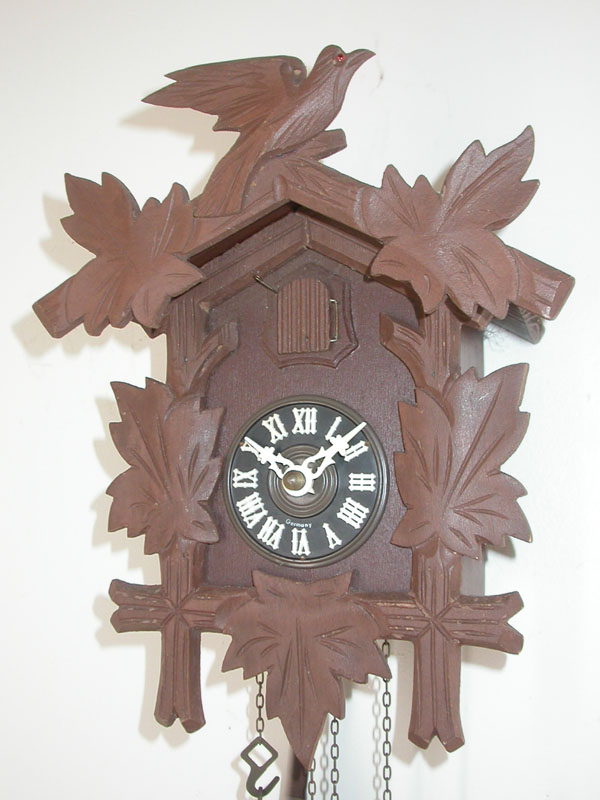 Tiny German Black Forest Quiet Cuckoo Clock - t0599 This attractive tiny weight driven cuckoo clock was made in the Black Forest area of Germany in the 1960-70s. The movement is original and has been completely overhauled and restored to great working condition. The clock is a time only movement with only the carved bird above the dial. It measures 6 inches by 3.5 inches by 8 inches high. Price: $100.00Cdn Contact us |