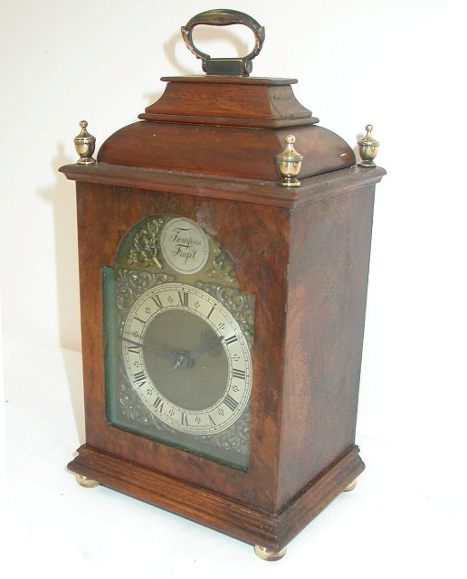 Miniature R Webster Caddy Top Walnut Bracket Clock - t0321 This miniature 18th century style walnut bracket clock was made in the late 1800s by R Webster of Queen Victoria Street London using a Swiss Burens top covered platform escapement movement. The movement is original and has been completely overhauled and restored to great working condition. The gorgeous walnut caddy top case with its carrying handle and gleaming brass finials is in good shape. It measures 5.5 inches by 4 inches by 10 inches high. Price: $500.00Cdn Contact us |