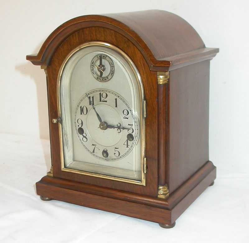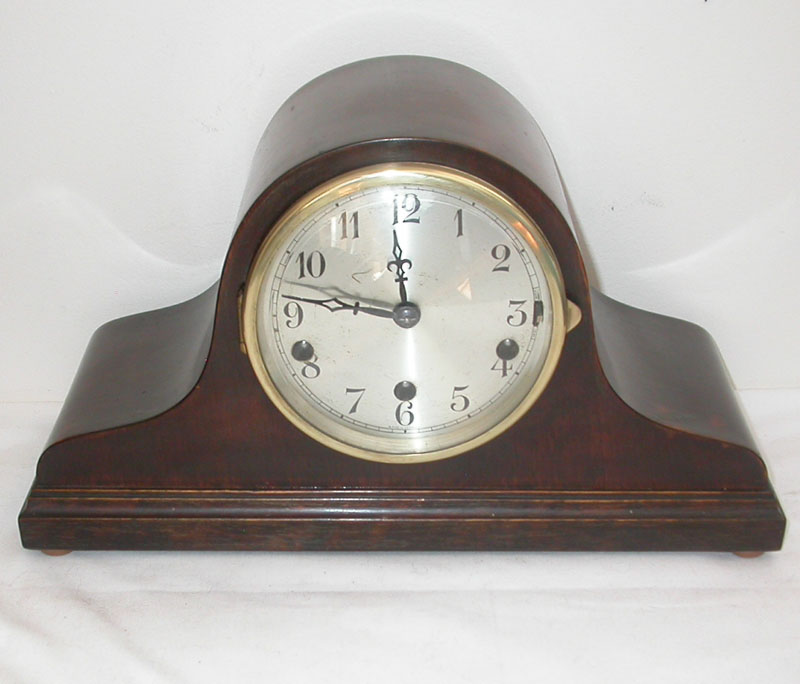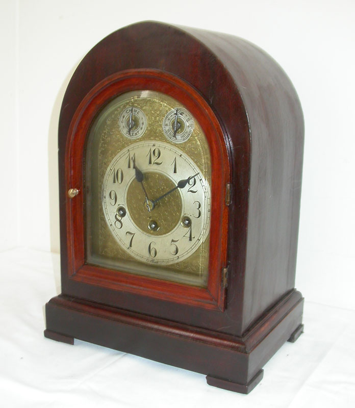 German 3 Tune Quarter Chime Red Mahoghany Mantle Clock - t0479 This beautiful red mahoghany high quality 3 tune German mantle clock was made by in the Black Forest area in the 1920-30s. It has recently been completely overhauled and is running very well. This is an 8 day movement. The clock rings out the sounds of the selected London clock tower tune on 8 rods every 15 minutes and strikes out the hours beautifully. There is a lever next to the face where it can be set to play either the Big Ben Westminster chimes or the Whittington or the St Michael ones. There is a second lever to silence these chimes if and when desired.. The cabinet is attractive and also serves as a very fine sound box for the set of fine quality brass rod chimes. Key and pendulum are included. It measures 18.5 inches by 6 inches by 8.5 inches high. Price: $400.00Cdn Contact us |