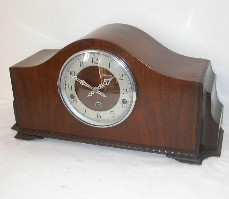 Junghans Art Deco Westminster Chime Mantle Clock - t0550 This attractive deco style oak westminster mantle clock was made in Germany during the 1930-50s by the Junghans Company. The movement is original and has been completely overhauled and restored to great working condition. The gorgeous case with its gleaming chromed brass bezel and silvered chapter ring dial is a high quality walnut . The clock rings out the sounds of London's Big Ben Westminster chimes every 15 minutes and strikes out the hours beautifully. The attractive cabinet serves as a very fine sound box for the set of chimes. Key and pendulum are included. It measures 15 inches by 5.75 inches by 8 inches high. Price: $300.00Cdn Contact us |