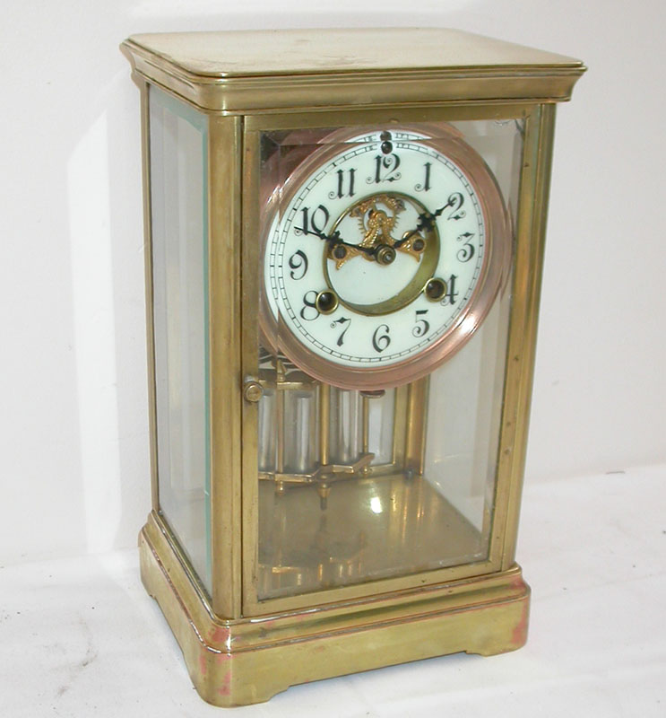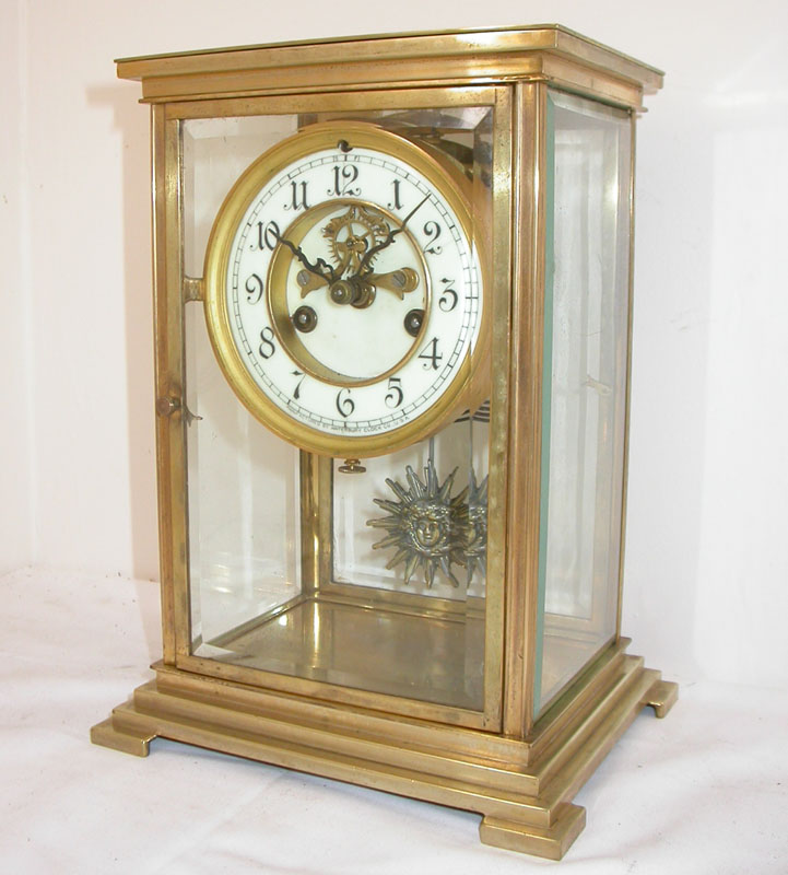Waterbury Open Escapement Crystal Regulator Clock - t0354 This beautiful antique crystal regulator clock was made in the late 1800s or early 1900s by the famous New England Waterbury Clock Company. The movement has an open escapement visible through the porcelain dial. Movement is original and has been completely overhauled and restored to great working condition. The gorgeous gleaming brass case with it panes of bevelled glass has one door at the front and another at the rear. The pendulum is a lovely brass sunshine cameo. The clock strikes the hour and the half hour on a melodious deep gong. Key and pendulum are included. It measures 7.5 inches by 6 inches by 10.5 inches high. Price: $400.00Cdn Contact us |