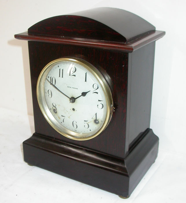 Cherry Red Seth Thomas Adamantine Mantle Clock - t0377 This attractive Seth Thomas Mantle Clock was made in the 1920-30s. The movement is original and has been completely overhauled and restored to great working condition. The gorgeous adamantine case with its gleaming brass bezel is a lovely red cherry colour. It strikes the hour and the half hour on a melodious medium gong. Key and pendulum are included. It measures 8.25 inches by 5.25 inches by 11 inches high. Price: $250.00Cdn Contact us |