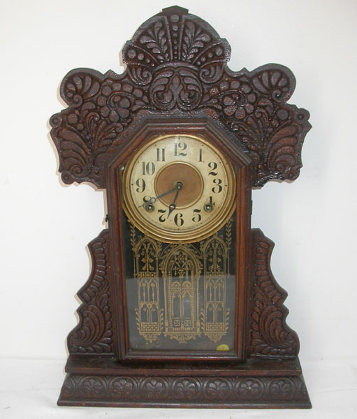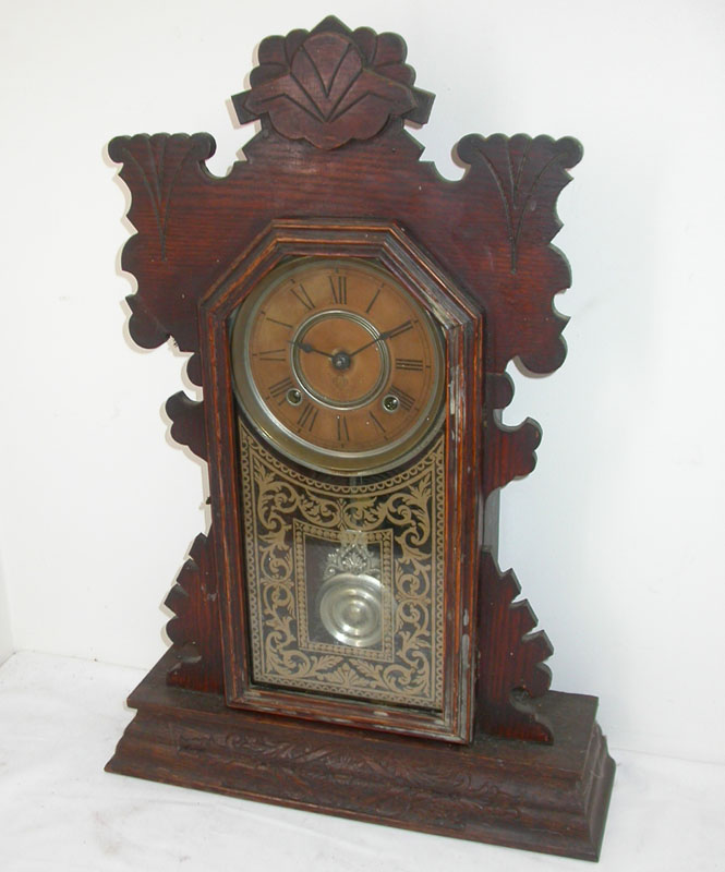 1800s Ingraham Oak Gingerbread or Kitchen Clock - t0431 Lovely oak cased Gingerbread (or Kitchen) mantle clock. It was made in the 1800s by the Ingraham clock company . The 8 day movement has recently been completely overhauled and works well. It strikes the hour and half hour on a gong. It measures 15 inches by 5 inches by 22 inches high. Price: $300.00Cdn Contact us |