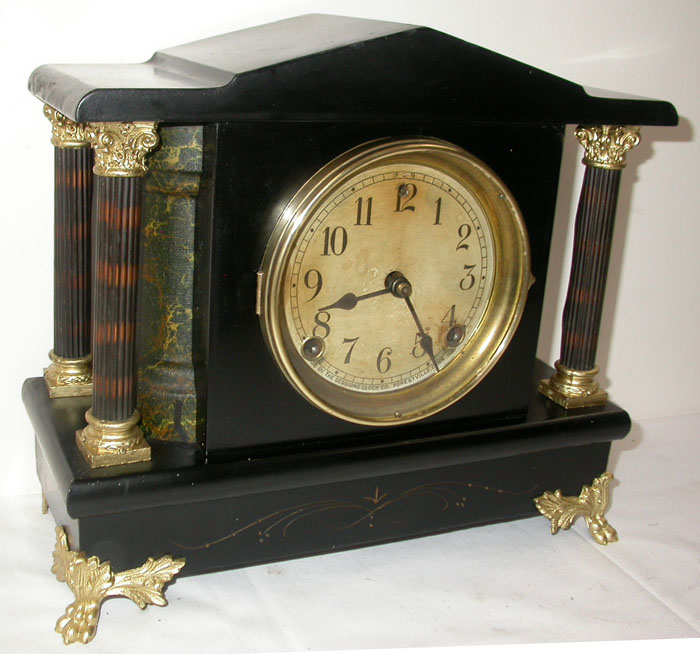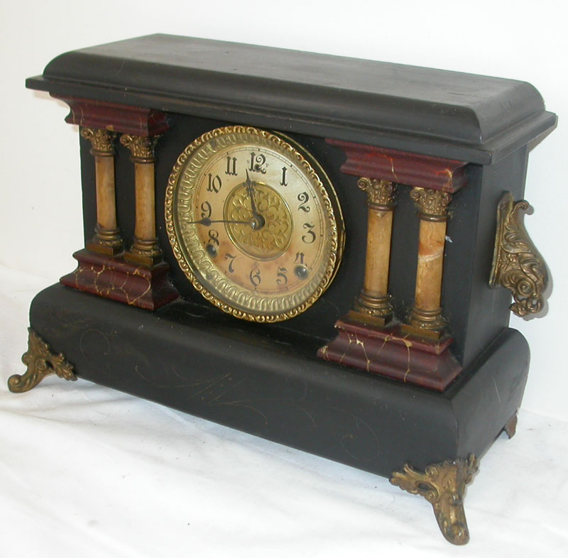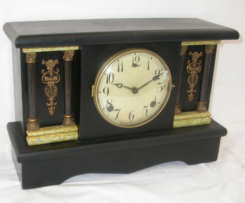 Sessions Black Mantle Grecian Columns Clock - t0395 This Sessions black mantle clock with its lovely marbelized Grecian Columns was made in New England in the early 1900s. The movement is original and has been completely overhauled and restored to great working condition. The gorgeous case with its ornate hardware and columns also has a gleaming brass bezel. It strikes the hour on a melodious deep gong and the half hour on a small bell. Key and pendulum are included. Key and pendulum are included. It measures 12.75 inches by 5.25 inches by 11.5 inches high. Price: $300.00Cdn Contact us |