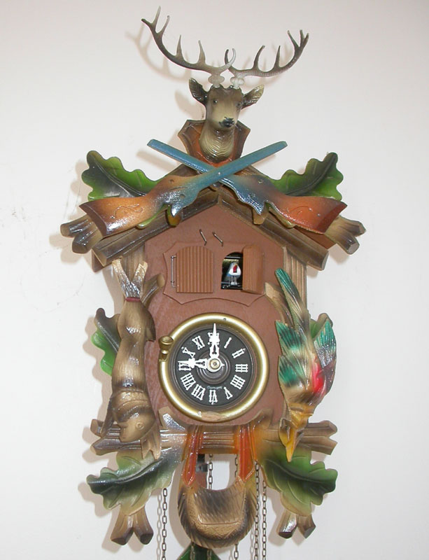 Hunters Antique Black Forest 8 Day Cuckoo Clock - t0554 This classic cuckoo clock was made in the Black Forest area of Germany by E Schmeckenbecher in the 1930-40s. The 8 day movement is original and has been completely overhauled and restored to great working condition. The gorgeous typical Black Forest hunting case is in nice shape. The bird calls the hour and the half hours The case excluding the weights and pendulum measures 8.5 inches by 6 inches by 12 inches high. Price: $400.00Cdn Contact us |