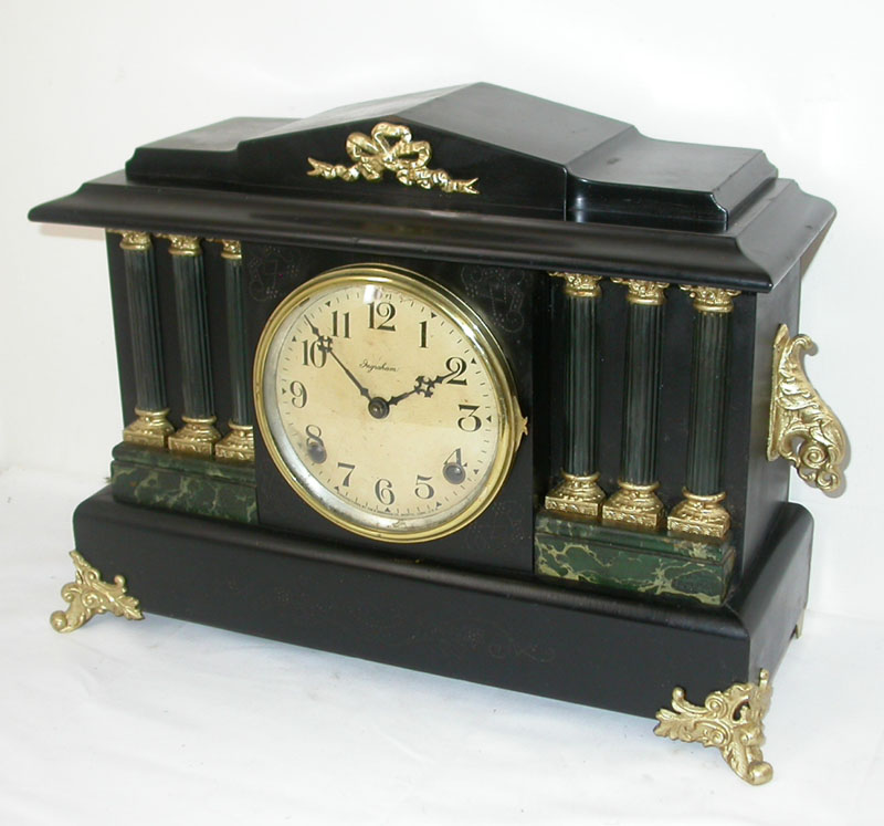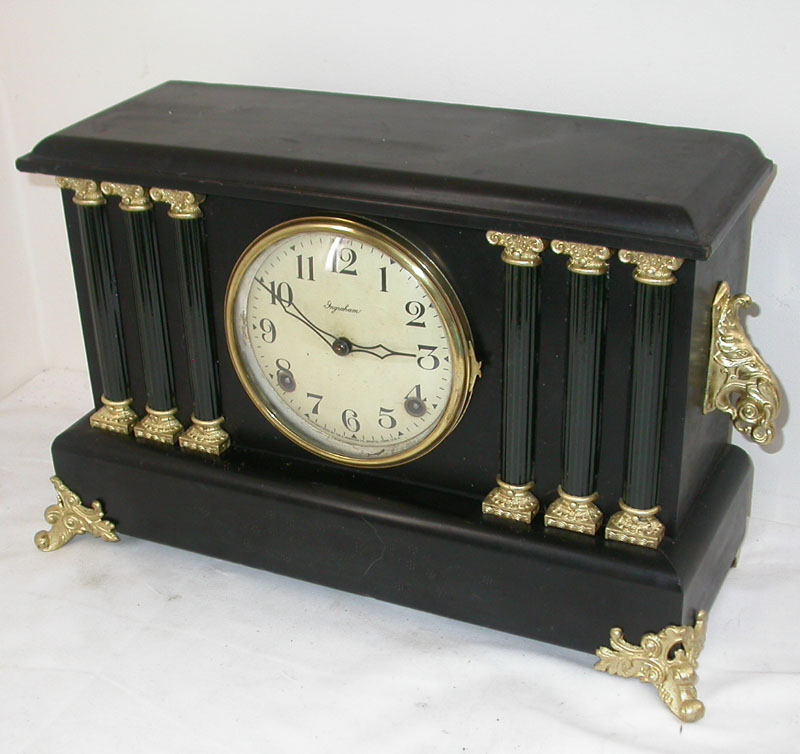 Ingraham Black Mantle Clock with Grecian Columns - t0403 This stately black mantle clock with its lovely Grecian Columns was made by the E Ingraham Clock Company in New England in the early 1900s. The movement is original and has been completely overhauled and restored to great working condition. The gorgeous case with its ornate golden hardware and stately columns also has a gleaming brass bezel. It strikes the hour and the half hour on a melodious deep gong. Key and pendulum are included. It measures 17.5 inches by 6 inches by 10.5 inches high. Price: $250.00Cdn Contact us |
