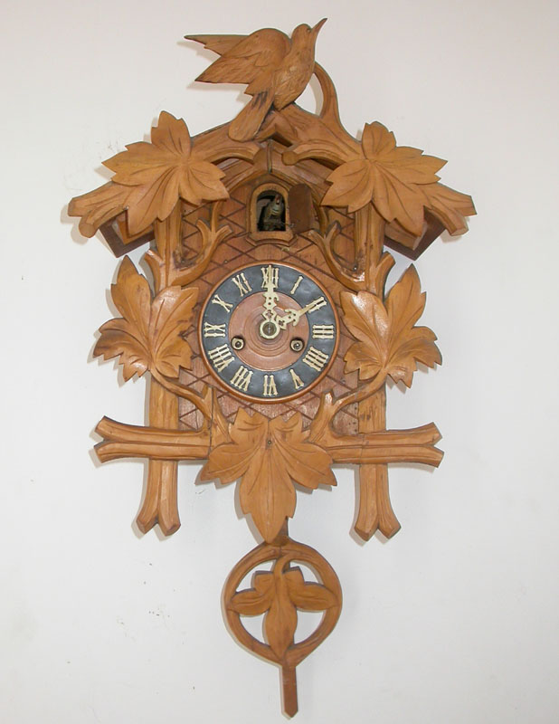 Rare Key Wound Carved Junghans Cuckoo Clock - t0463 This rare cuckoo clock was made by the Junghans Clock Company in the Black Forest region of Germany in the 1920-30s. It has a wind-up movement which has recently been serviced and works well. The hand carved and painted wooden bird calls out each hour and half hour with its pair of bellows and the clock also strikes a melodious deep gong at the same time. Key is included. It measures 11.5 inches by 8 inches by 16 inches high. Including the pendulum the height is 22 inches high. Price: $400.00Cdn Contact us |