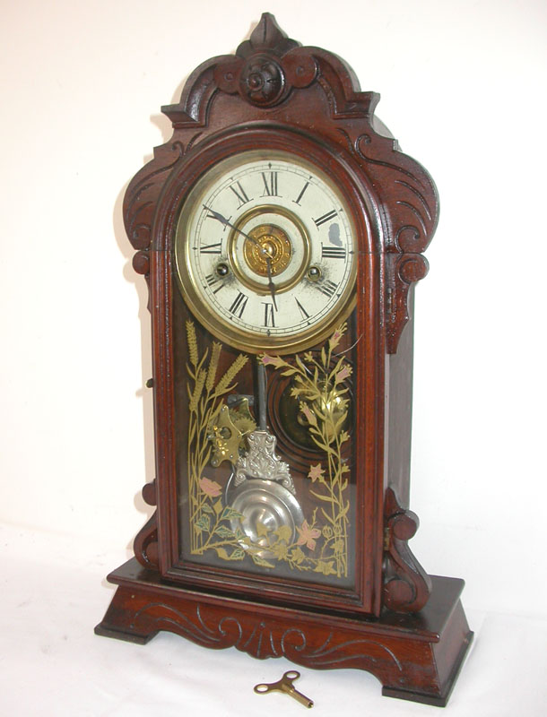 New Haven Walnut Kitchen Clock - t0480 This is an attractive New Haven walnut cased kitchen clock and was made in the 1870-80s. It has the original pinned movement and alarm mechanism and has been completely overhauled and restored to great working condition. This makes the clock a real bargain because of the high cost of getting one overhauled & restored. The movement is the spring wound 30 hour type which actually runs for more than 2 days. The gorgeous walnut case has the original glass with its pretty colored floral designs. It strikes the hours out on a deep gong. Most of the original label remains on the back of the case identifying it as a striking alarm model. Key and pendulum are included. It measures 11 inches by 4.25 inches by 18 inches high. Price: $300.00Cdn Contact us |
