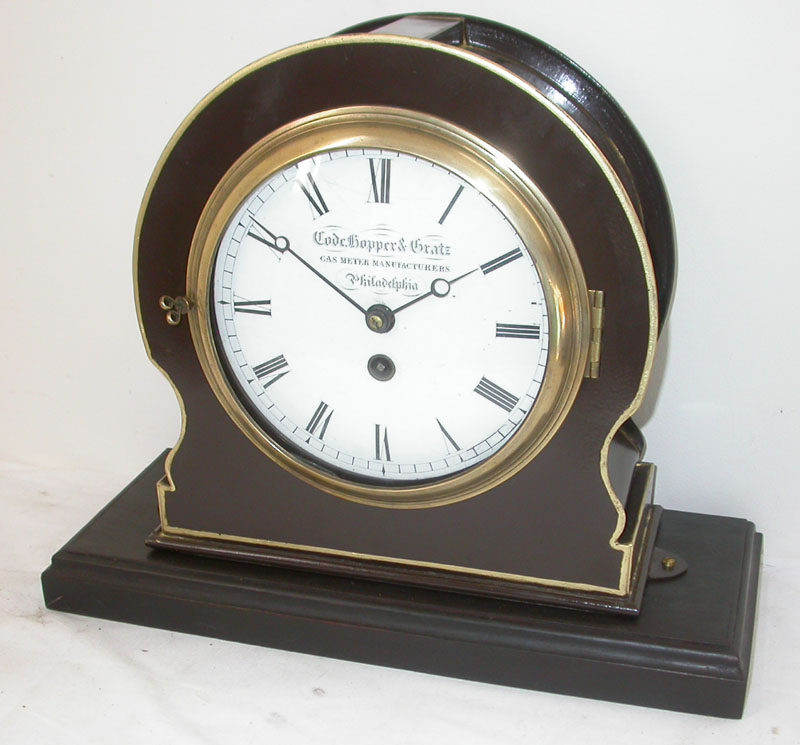Unique 1860s Philadelphia Fusee Mantle Clock with PTO - t0517 This unique fusee clock from Philadelphia was made in the 1860s. The movement probably made in England and is original and has been completely overhauled and restored to great working condition. The movement is unusual in that it is a three day one with a massive wheel to supply power to some sort of automation that must once have been attached below the clock. The sturdy rounded metal case has a gleaming brass bezel. The porcelain dial reads Code Hopper and Gratz Gas Meter Manufacturers Philadelphia. This firm were active around 1860 and provided meters to clients such as the Pennsylvania Hospital. Dial has some minor hairlines around the 11-12 area. The mahogany base was made recently to mount the clock for use as a mantle clock. Paint has been renewed and matches the original color and patterns. Pendulum and crank are included. It measures 17 inches by 7 inches by 14 inches high. Price: $700.00Cdn Contact us |