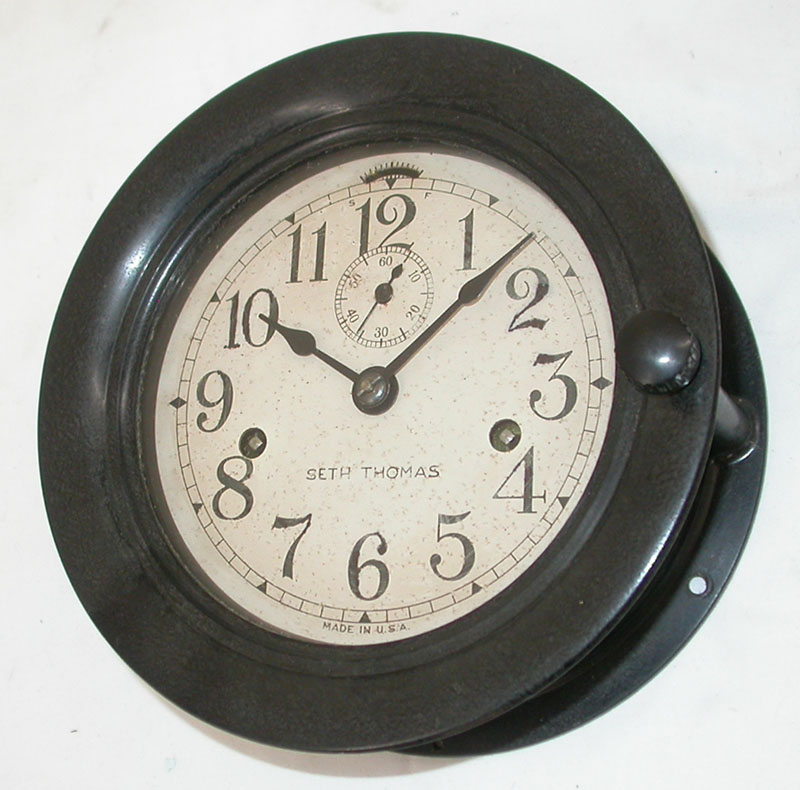 Seth Thomas Double Mainspring Ships Clock - t0531 This vintage ships clock was made by the New England Seth Thomas Company in the earlier 1900s. The movement which has two mainsprings both driving the time gears is original and has been completely overhauled and restored to great working condition. The case looks to be bakelite and is in good condition. Key is included. It measures 8 inches in diameter by 3.75 inches high. Price: $400.00Cdn Contact us |