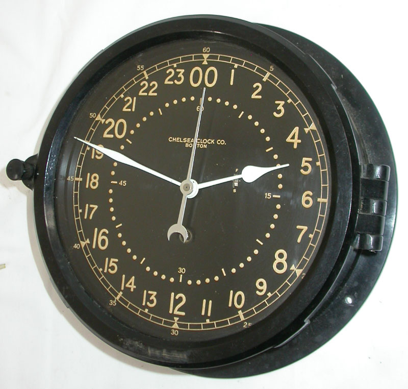 Large Chelsea Ships Clock - t0534 This large ships clock was made by the Chelsea Clock Co of Boston for the military or coastguard in the 1970s. The time only movement is original and has been completely overhauled and restored to great working condition. Case and dial are in good shape. Key is included. It measures 10.25 inches in diameter by 3.5 inches high. Price: $400.00Cdn Contact us |