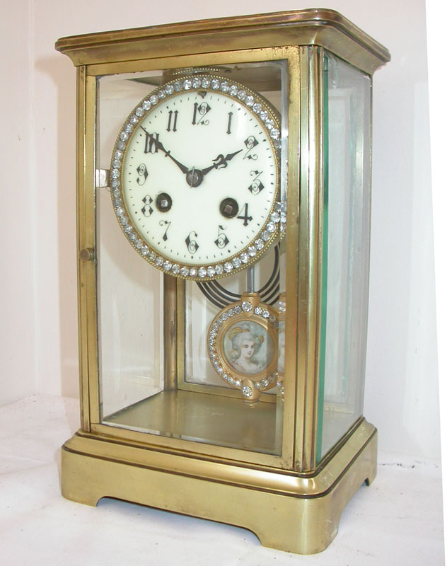 Marie Antoinette Crystal Regulator Clock - t0548 This beautiful antique French crystal regulator clock was made in the late 1800s or early 1900s by the famous Japy Freres company. The movement is original and has been completely overhauled and restored to great working condition. The gorgeous gleaming brass case with its rhinestones and panes of bevelled glass has one door at the front and another at the rear. Side glass panels have minor corner chips. The dial is porcelain. The brass pendulum holds a beautiful rhinestone rimmed cameo which looks to be Marie Antoinette. The clock strikes the hour and the half hour on a melodious deep gong. Key and pendulum are included. It measures 6 inches by 5 inches by 10 inches high. Price: $500.00Cdn Contact us |