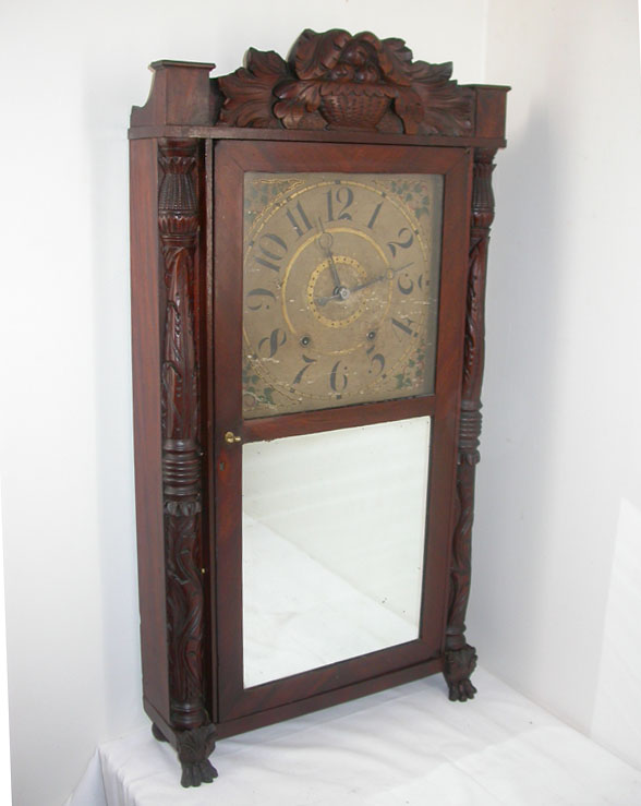 Superb Carved 8 day Wood Movement Eli Terry Shelf Clock - t0560 This superb and rare mirrored column and splat shelf (or wall) clock was made in New England around 1830. Eli Terry Jr. was the famous Eli Terry’s son. The 8 day wooden gears movement is original and has been completely overhauled and restored to great working condition. The gorgeous carved column and splat case looks to still have the original mirror and upper glass. The painted face is also original as is the label inside and probably the key crank. Weights are replacements. It strikes out the hours on a large cast bell. Key and pendulum are included. It measures 17.5 inches by 5 inches by 33.75 inches high. Price: $600.00Cdn Contact us |