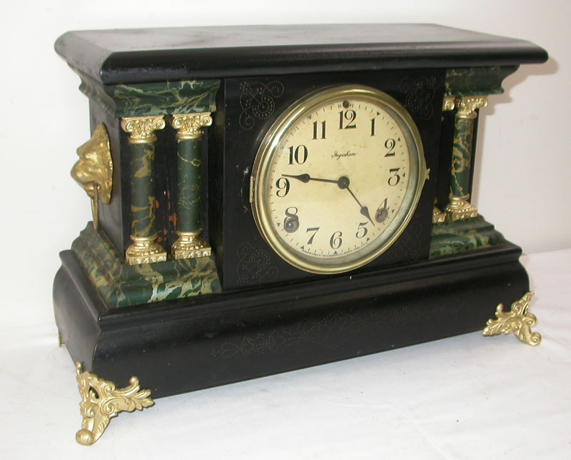 Lion Handles Sessions Grecian Columns Clock - t0337 This elegant black mantle clock with its lovely marbelized Grecian Columns was made by the Sessions Clock Co of New England in the early 1900s. The movement is original and has been completely overhauled and restored to great working condition. The gorgeous ebonized case with its brass lion handles ornate hardware and green marbelized columns also has a gleaming brass bezel. Face is original and has a water stain across top. It strikes the hour on a medium pitch gong and the half hour on a bell. Key and pendulum are included. It measures 16 inches by 6 inches by 10 inches high. Price: $300.00Cdn Contact us |