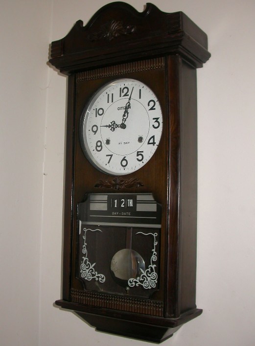 Citizen 31 Day Wall Regulator Calendar Clock - t0580 This classic Citizen wall clock was made in the 1960-70s. The Korean 31 day calendar movement is original and has been completely overhauled and restored to great working condition. The classic dark finish wood cabinet is in nice shape and has a convex glass over the dial. It strikes the hour and the half hour on a melodious deep gong. Key and pendulum are included. It measures 12.5 inches by 5 inches by 28 inches high. Price: $300.00Cdn Contact us |