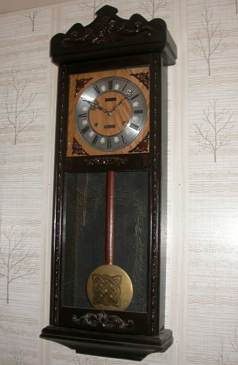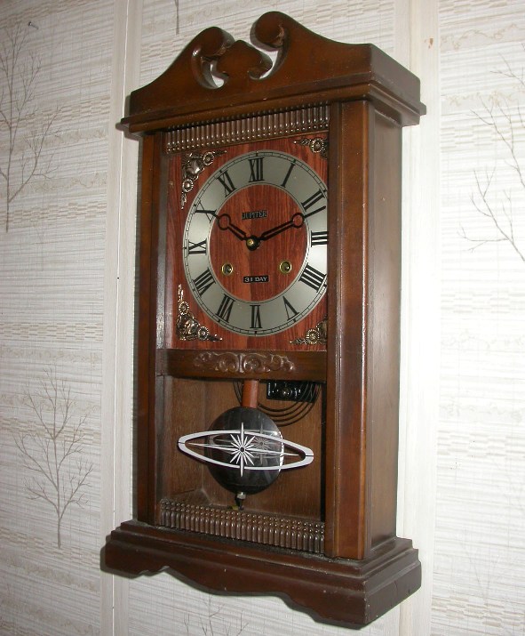 Jupitor 31 Day Wall or Shelf Regulator Clock - t0607 This pretty regulator clock was made in the 1960-70s by the Jupitor Clock Company of Korea. Clock has been designed either be hung on a wall or stood on a shelf. The 31 day movement is original and has been completely overhauled and restored to great working condition. The gorgeous brown case with its gleaming chromed pendulum is in good condition. Clock strikes out the hour and half hour on a melodious deep gong. Key and pendulum are included. It measures 12.25 inches by 5 inches by 22.5 inches high. Price: $300.00Cdn Contact us |