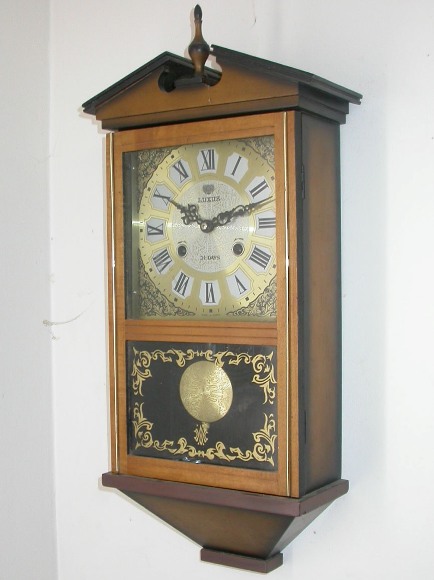 Gold Trimmed Luxus 31 Day Wall Clock - t0608 This pretty Luxus wall clock was made in the 1960-70s. The Korean 31 day movement is original and has been completely overhauled and restored to great working condition. It strikes the hour and the half hour on a melodious deep gong. Key and pendulum are included. It measures 9.75 inches by 4.75 inches by 24 inches high. Price: $300.00Cdn Contact us |