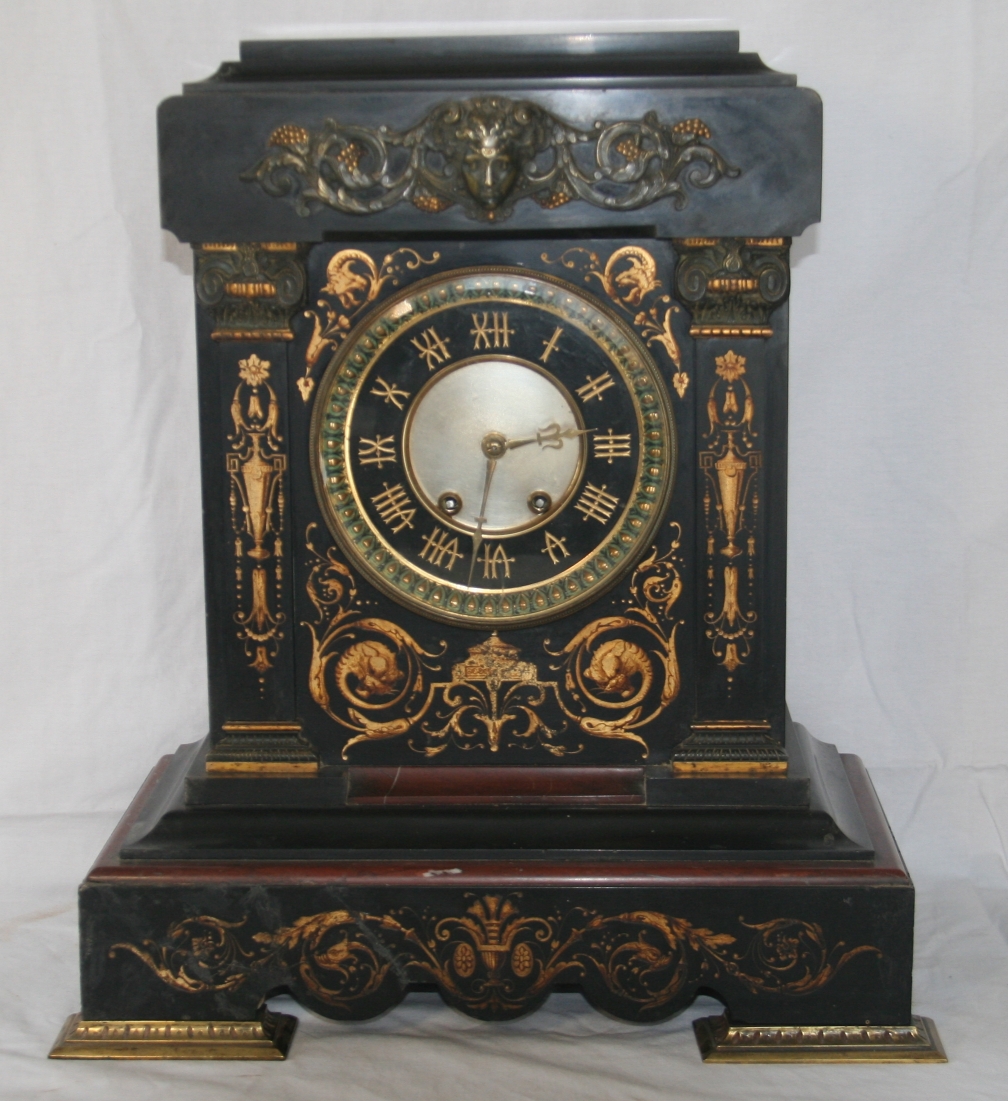 Impressive 1800s French Marble & Slate Bracket Clock - t0623 This superb French marble & slate bracket clock was made in the 1800s. It is large and very heavy. The movement has recently been fully serviced and the clock runs well The gorgeous case with its gleaming brass bezel is a high quality hardwood. It strikes the hour and the half hour on a melodious deep gong. Key and pendulum are included. It measures 17 inches by 9 inches by 19.5 inches high. Price: $1500.00Cdn Contact us |