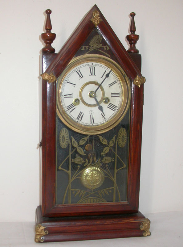 1800s Ansonia Twin Spire Steeple Clock - t0634 This lovely restored Ansonia twin spire steeple clock was made in New England the mid 1800s. The movement is original and has been completely overhauled and restored to great working condition. The door glass looks original and is nicely decorated. The face is a replacement copy. The clock strikes the hour on a medium pitch gong. It measures 8 inches by 4 inches by 16 inches high. Price: $300.00Cdn Contact us |