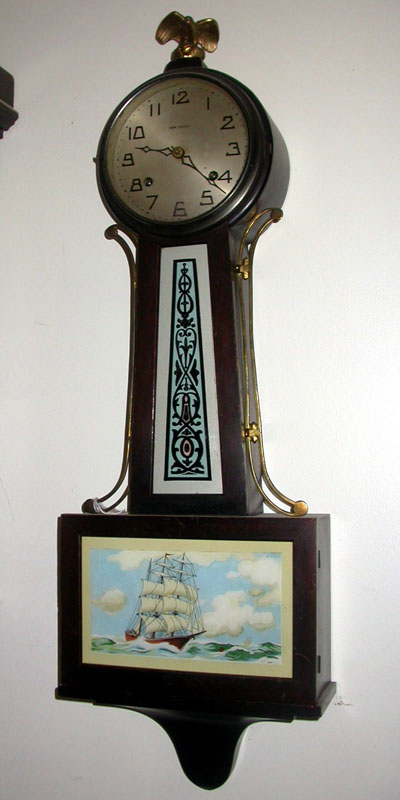 New Haven Whitney Nautical Scene Banjo Wall Clock - t0648 This New Haven Whitney banjo wall clock was made in the early 1900s. The movement is original and has been completely overhauled and restored to great working condition. It strikes the hour and the half hour on a melodious chime rod. Key and pendulum are included. It measures 10 inches by 4 inches by 31 inches high. Price: $300.00Cdn Contact us |