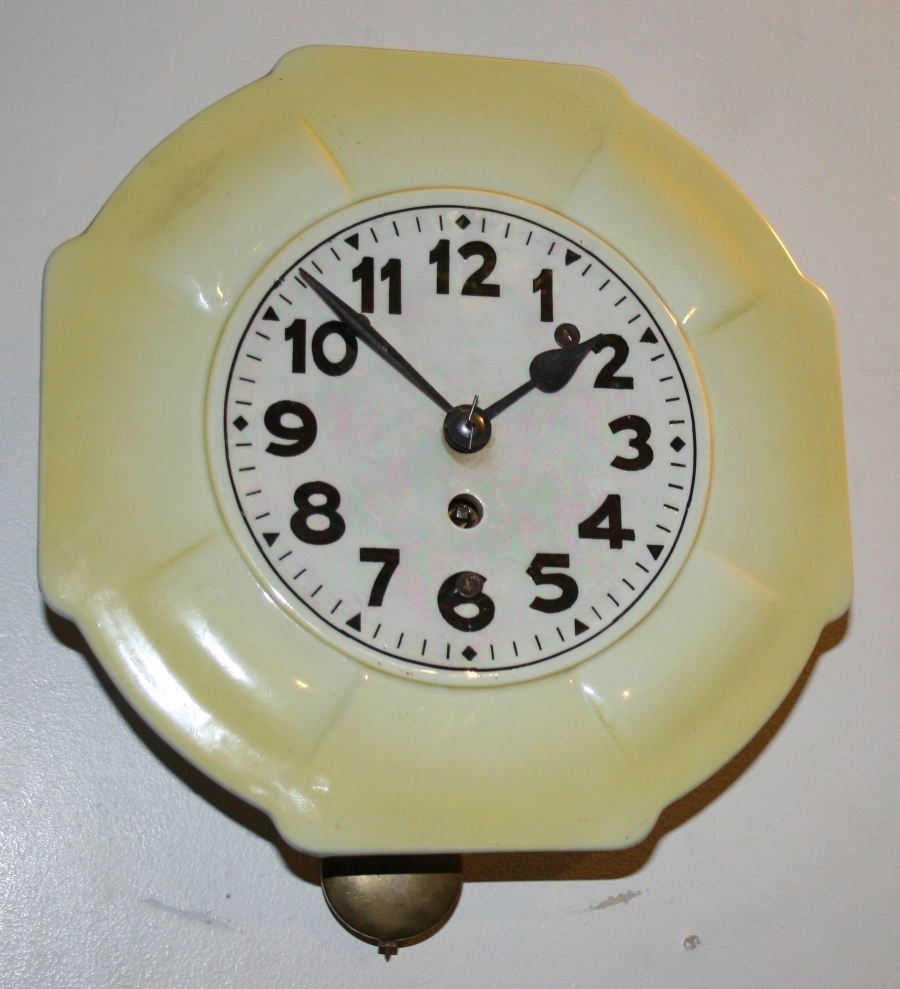 Bright Yellow German 1930s Porcelain Kitchen Wall Clock - t0746 This bright yellow German 1930s Porcelain Kitchen Wall Clock was made in the 1930s. The wind-up pendulum movement has recently been completely serviced and runs well. Key and pendulum are included. It measures 9 inches wide by 3 inches deep by 9 inches high. Price: $100.00Cdn Contact us |